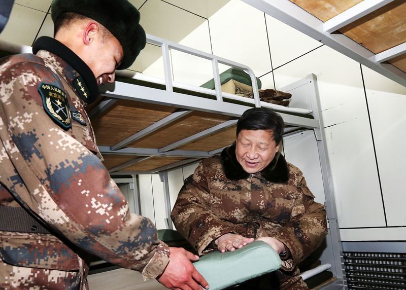 習近平主席在邊防某團一連視察戰士宿舍,關心士兵的住宿條件與生活環境。